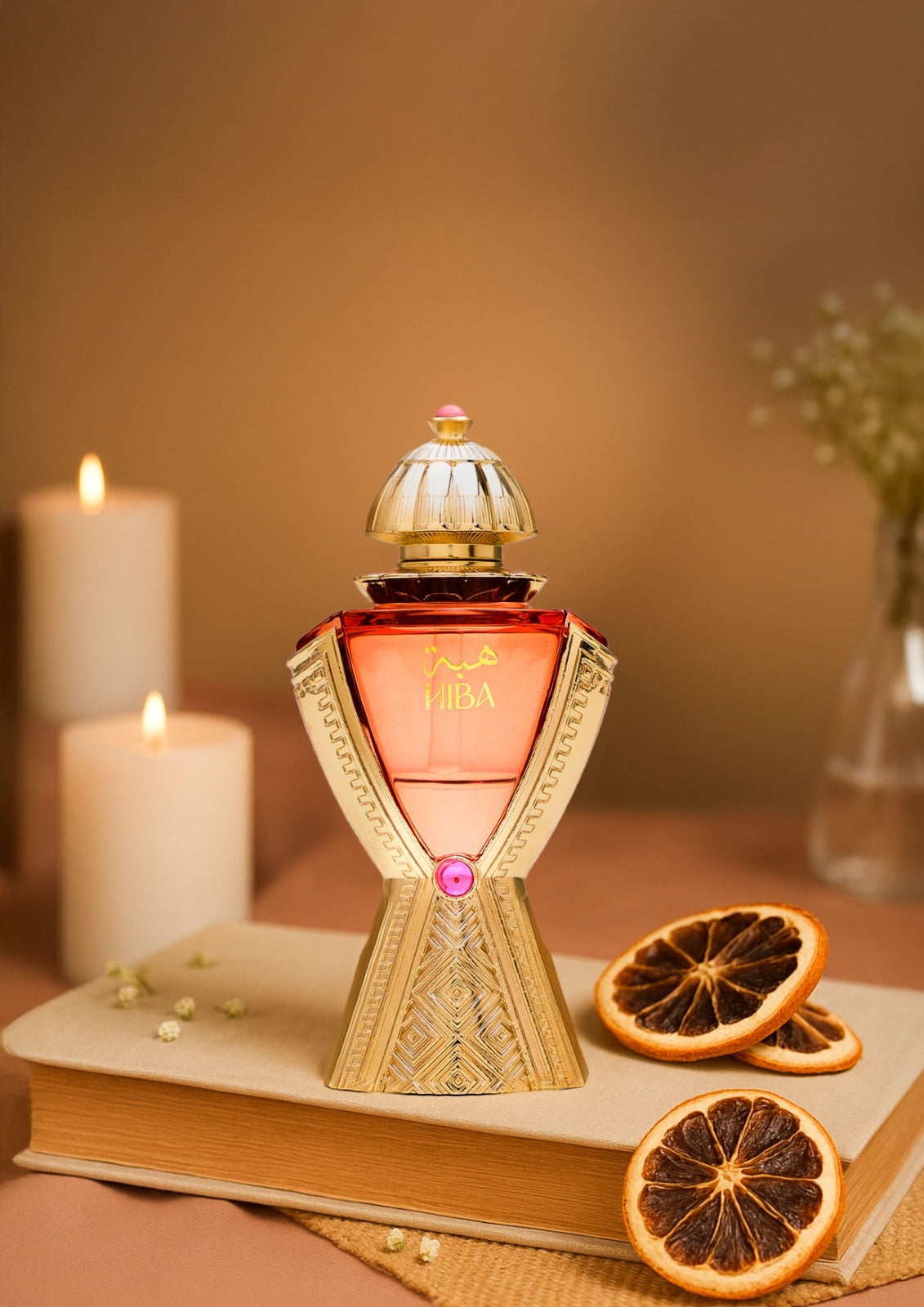 Hiba Attar is a captivating floral-fruity fragrance with a touch of amber. It opens with a delightful fruity accord, featuring the juicy sweetness of white peach and pear nectar, creating an uplifting and refreshing top.