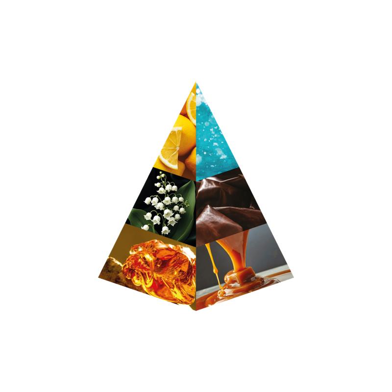 Cedarwood and moss anchor the heart, a shadowed contrast to sweetness. Caramel and ambergris smolder on the skin, warm and mysterious.